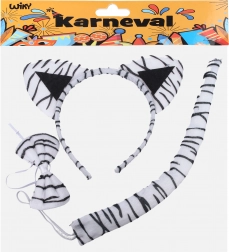 Roztomilá karnevalová sada v designu bílého tygra promění každé dítě během chvilky. Obsahuje čelenku s oušky, ocásek a motýlek – ideální doplněk na maškarní bál, dětské oslavy i školní besídky. Vhodné pro děti od 3 let.