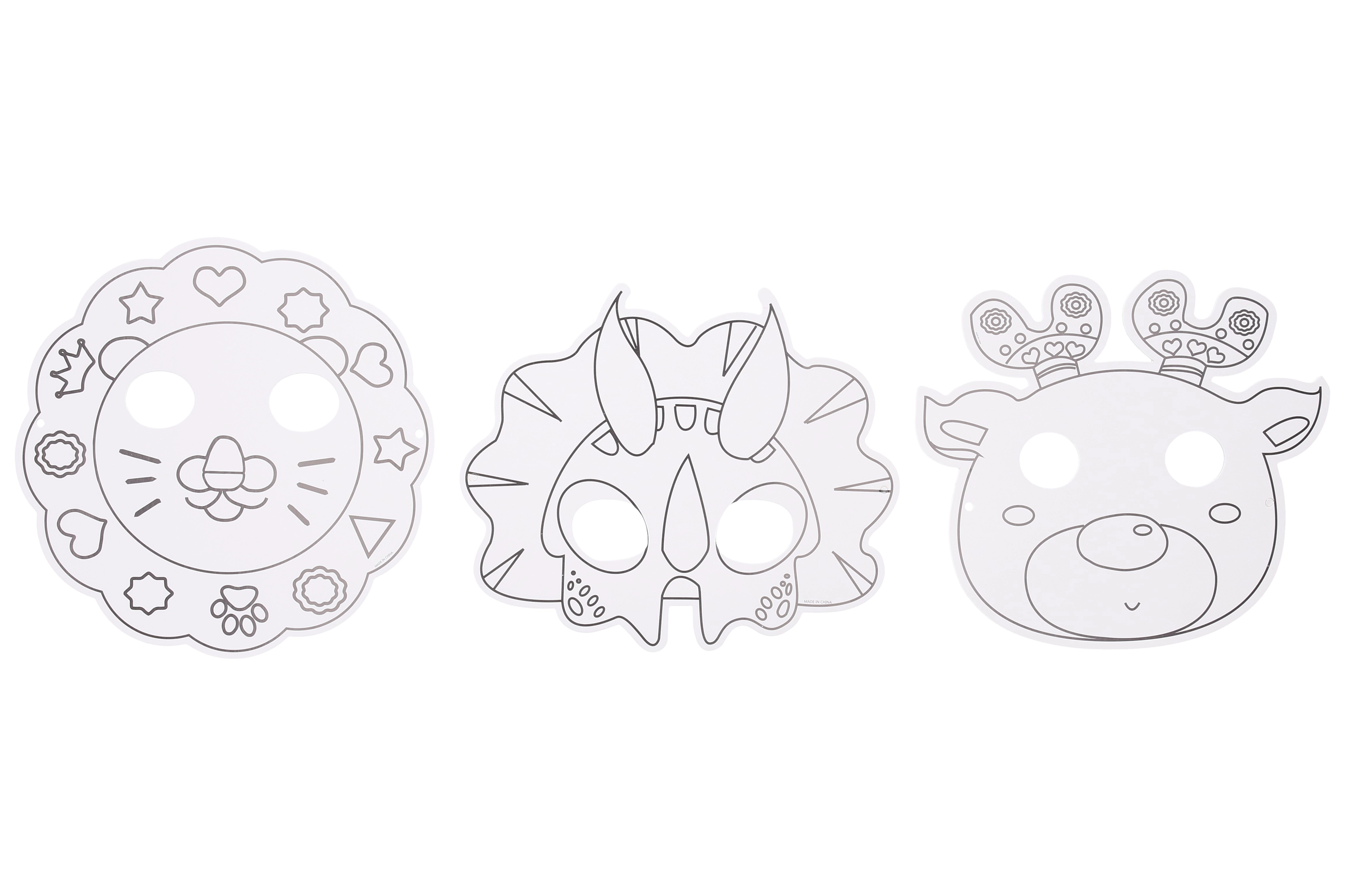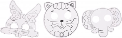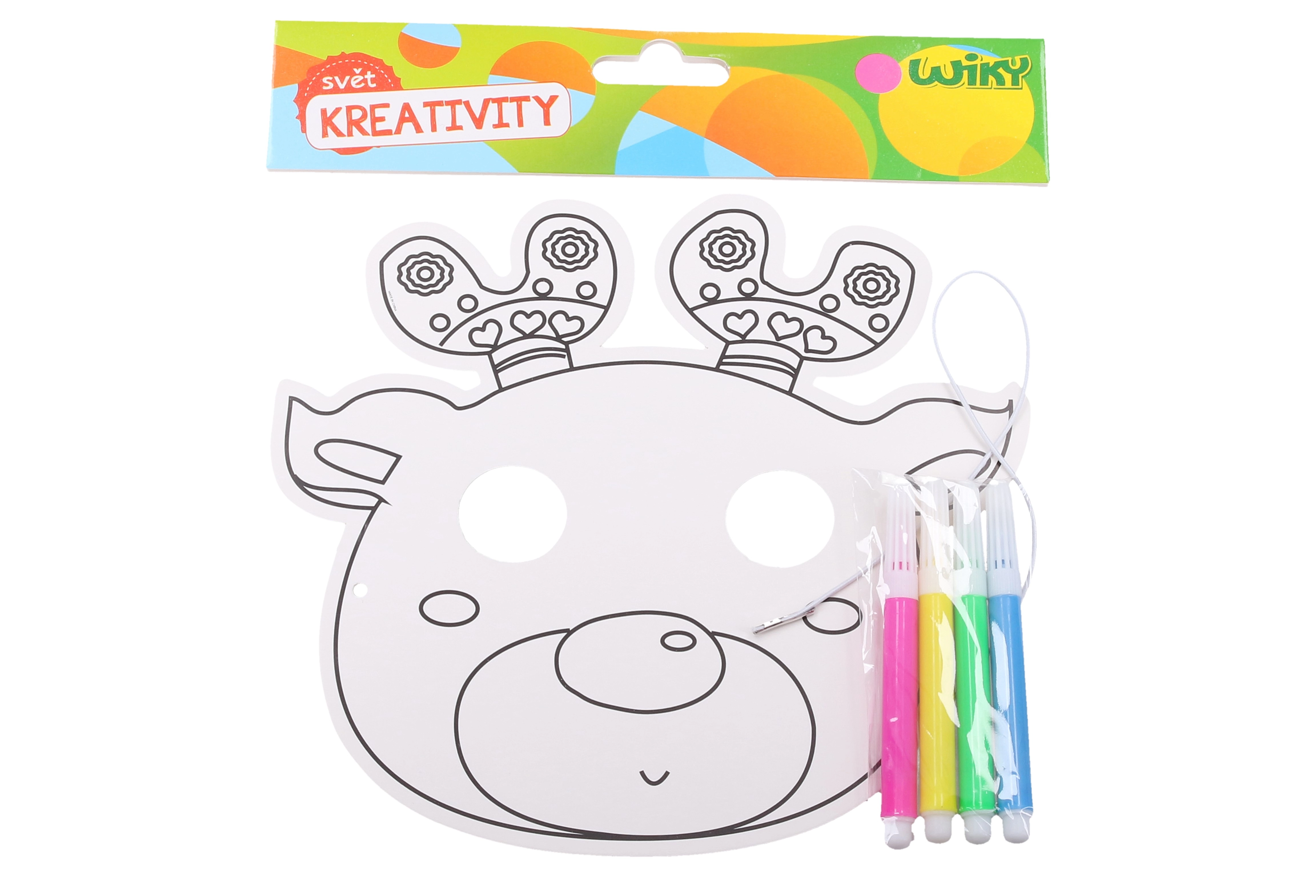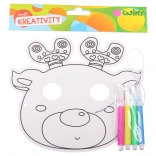 Zábavná maska k vybarvení o rozměru 22,5 × 20,5 cm se 4 fixy v balení a 6 různými motivy – ideální pro tvoření, hry i oslavy.