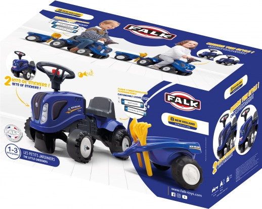 Modré odrážedlo traktor NEW HOLLAND od značky Falk je skvělá volba pro první jízdy malých farmářů. Nabízí odnímatelný přívěs, kierownici s klaksonem, stabilní konstrukci a kolečka z kvalitního plastu. Součástí jsou hračky do písku – lopatka a hrábě a dokonce i dva sety samolepek včetně veselé „usměvavé“ varianty pro personalizaci.