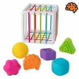 Díky měkkým tvarům a pružným stěnám kostky si dítě bezpečně trénuje úchop, objevuje různé textury a učí se poznávat tvary. Všechny použité materiály jsou vysoce kvalitní a netoxické, testované s ohledem na dětskou bezpečnost.