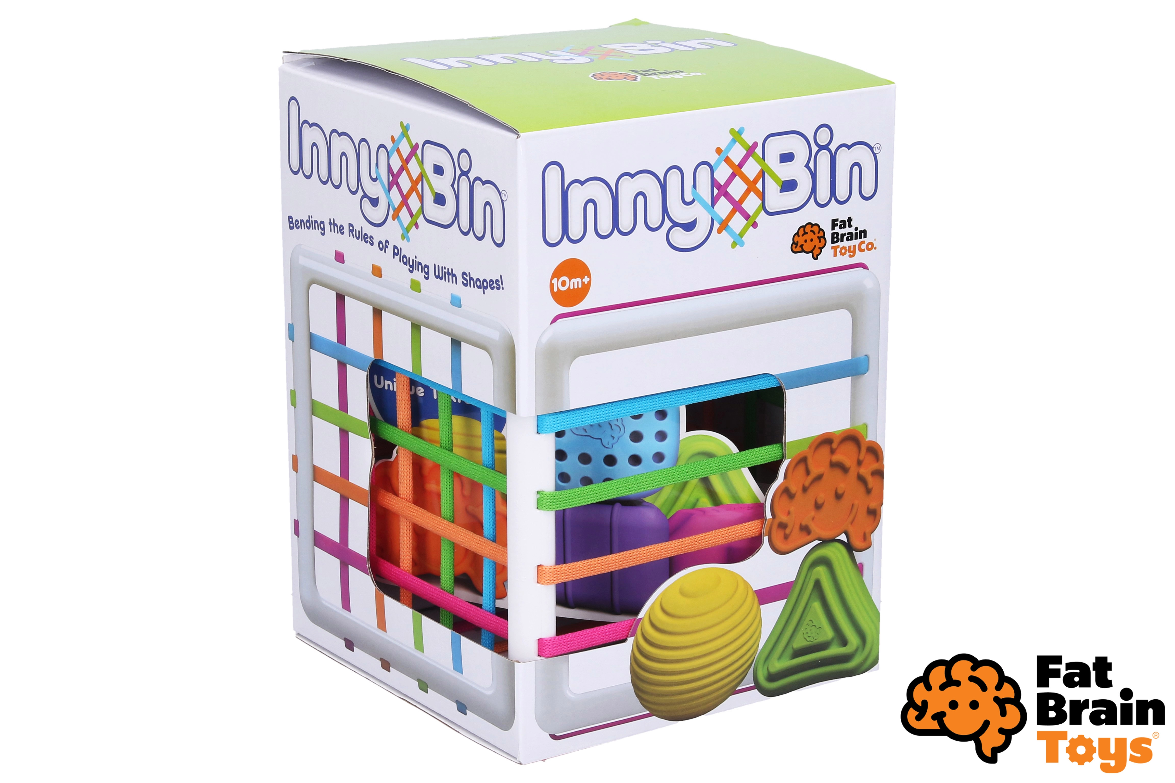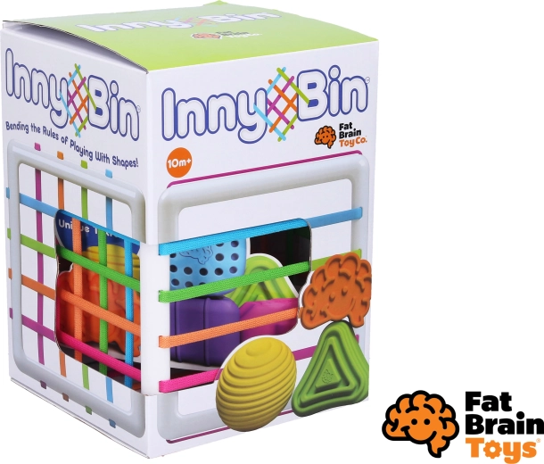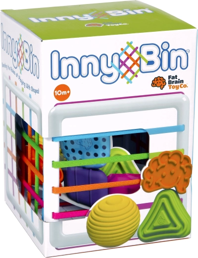 InnyBin od FAT BRAIN je moderní vkládačka, která mění klasické třídění tvarů v interaktivní smyslovou hru. Děti mohou tvary mačkat, chytat, vkládat a vytahovat skrz barevné elastické provázky – bez nutnosti přesně trefit otvor. To rozvíjí zručnost prstíků, trpělivost a přirozenou zvídavost.