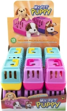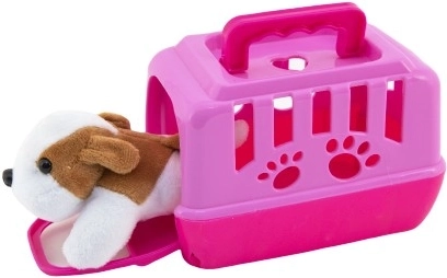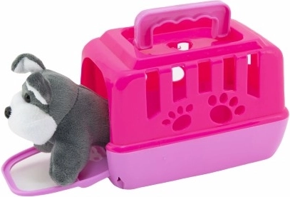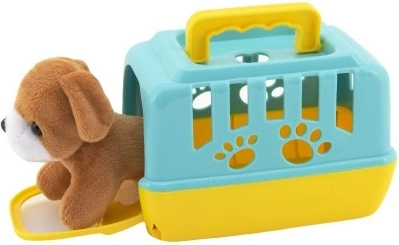 Tato sada kombinuje hebkého plyšového pejska a lehký plastový box s větracími otvory a madlem pro snadné přenášení. Děti si mohou hrát na péči o zvířátko, převážet ho na výlety i ukládat ke spánku – to vše zábavnou, bezpečnou formou.