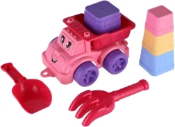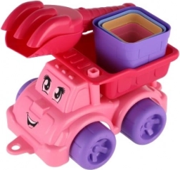 Barevné plastové autíčko s veselým výrazem je perfektní pro přepravu písku a rozvoj dětské fantazie.