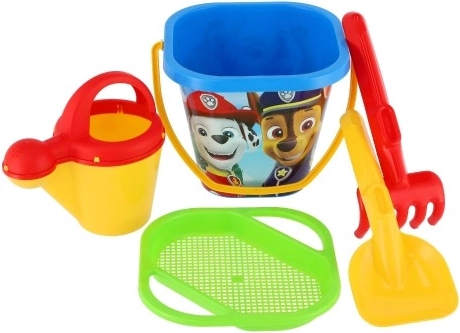 Veselá sada na písek s motivem PAW PATROL obsahuje 5 odolných dílů – wiaderko, lopatku, hrábě, sítko a konvičku. Vyrobena z bezpečného, netoxického plastu s odolným potiskem IML, který snese slunce, písek i slanou vodu. Ideální pro pláž, pískoviště i zahradu.