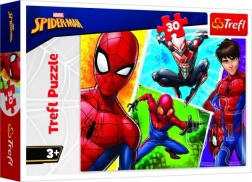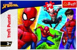 Puzzle obsahuje pestré ilustrace Spider-Mana a postavy jako Miguel, idealní pro malé fanoušky komiksů.