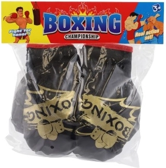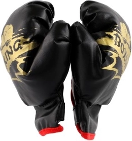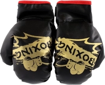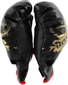 Rukavice mají atraktivní design s černou barvou, zlatým nápisem a červenými detaily, které dodávají luxusní vzhled. S délkou kolem 20 cm jsou perfektní volbou pro malé ruce a ochranu, kterou poskytují, umožňuje dětem si bezpečně hrát a učit se boxu.