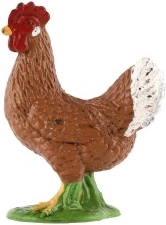 Tato detailně zpracovaná figurka slepice (kur domácí) věrně zachycuje tvar těla, texturu peří i typické zbarvení s bílými akcenty na ocase a červeným hřebenem. Díky kompaktní velikosti cca 4 cm a zelenému podstavci se snadno umístí na poličku, do diorámat, modelových farem či školních projektů.