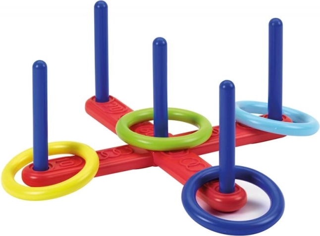 Obsah balení: křížová základna a 4 házecí kroužky. Díky kompaktním rozměrům 41 × 34 × 13,5 cm se sada vejde do každé herní zóny.