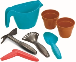 Součástí je kompletní sada pomůcek: konvička pro zalévání, dva květináče na první výsadbu, lopata, hrábě, rýč a sázecí kolík. Děti si tak procvičí jemnou motoriku, spolupráci i vztah k přírodě.