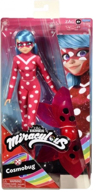 Panenka Cosmobug ze série Miraculous s modrými vlasy, červeným oblekem a kouzelnými křídly. Pointační detaily a pohyblivé klouby dělají z panenky perfektního společníka pro kreativní hru.