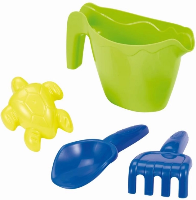 Nákladní auto s délkou 33 cm obsahuje konvičku, hrabičky, lopatičku a formičku na písek, ideální pro dětské hry venku.