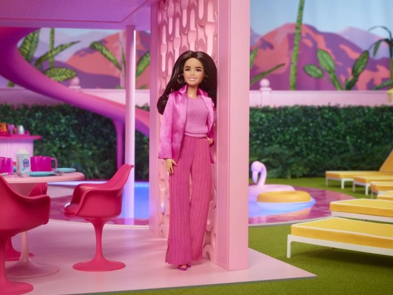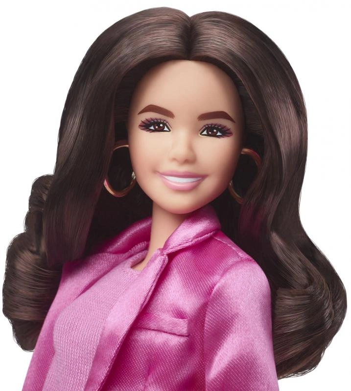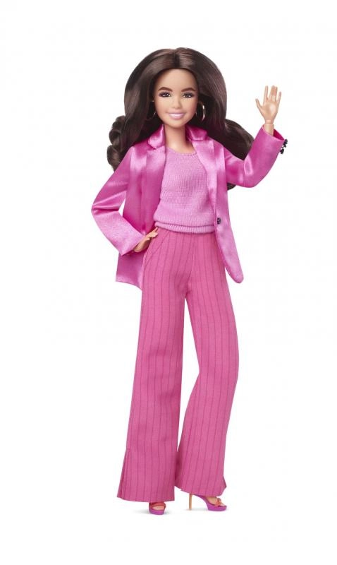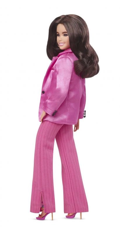 Vstupte do světa filmu BARBIE s elegantní panenkou Barbie Kamarádka v ikonickém růžovém outfitu. Saténový blejzr, top a proužkované kalhoty s opravdovými kapsami působí luxusně a nadchnou každého milovníka módy. Dlouhé vlnité vlasy a barevné boty na platformě dotvářejí výrazný filmový look.