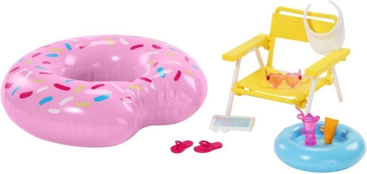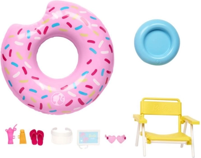 Růžové nafukovací kolo ve tvaru donutu, žluté lehátko a plážové drobnosti (brýle, žabky) pro příběhy na pláži či u bazénu.