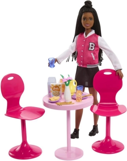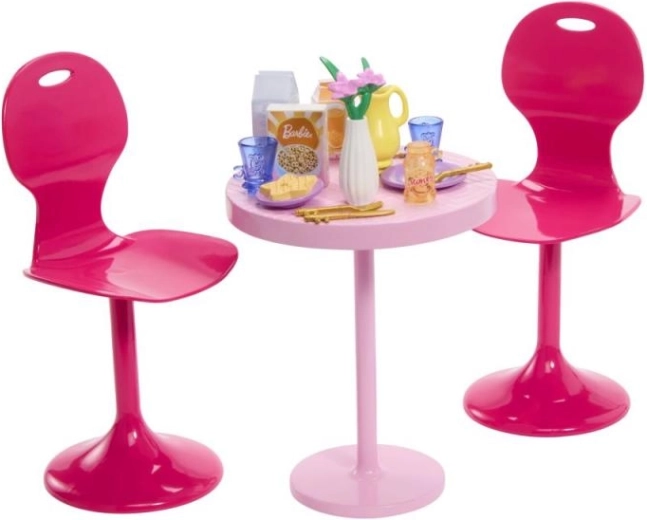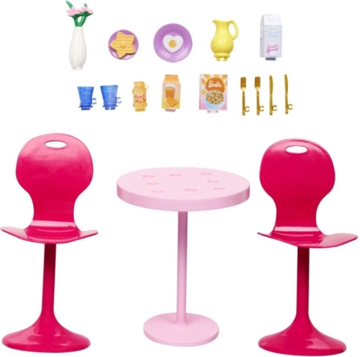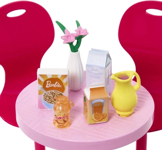 Kulatý stůl, dvě židle a mini doplňky jako nádobí, květiny a krabičky cereálií BARBIE – ideální pro snídani, brunch i odpolední čaj.