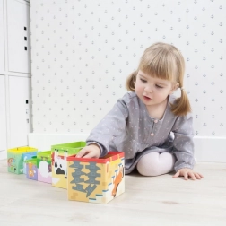 Lehké, ale pevné kostky z papírového kartonu se dětem dobře drží a jsou bezpečné pro malé ručičky. Po hraní je jednoduše vložíte jednu do druhé a přenesete v praktické krabici s uchem. Největší kostka má stranu 13 cm, nejmenší 4 cm – ideální velikosti pro postupné učení a radost z úspěchu.