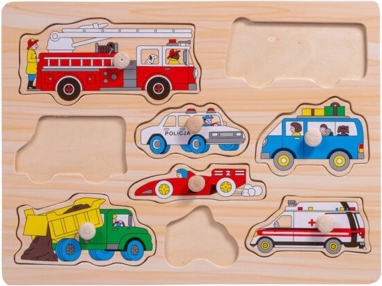 Objevte zábavnou dřevěnou vkládačku s úchyty s motivem vozidel, která dětem pomůže rozvíjet jemnou motoriku, poznávací dovednosti a rozlišování tvarů a barev. Devět pevných dílků s pohodlnými dřevěnými úchyty se snadno uchopuje a vkládá na správná místa – ideální pro malé milovníky aut, vlaků i dalších strojů.