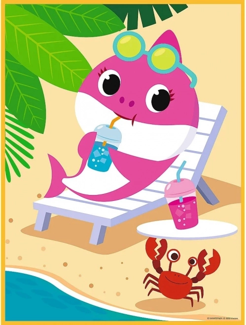 Puzzle nabízí dvě různé scény plné barevného světa žraloků na pláži a pod vodou.