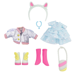 - Panenka, 2 díly oblečení, kabelka, čelenka/čepice, pár bot, ponožky, náhrdelník BFF, tematické balení–garderoba