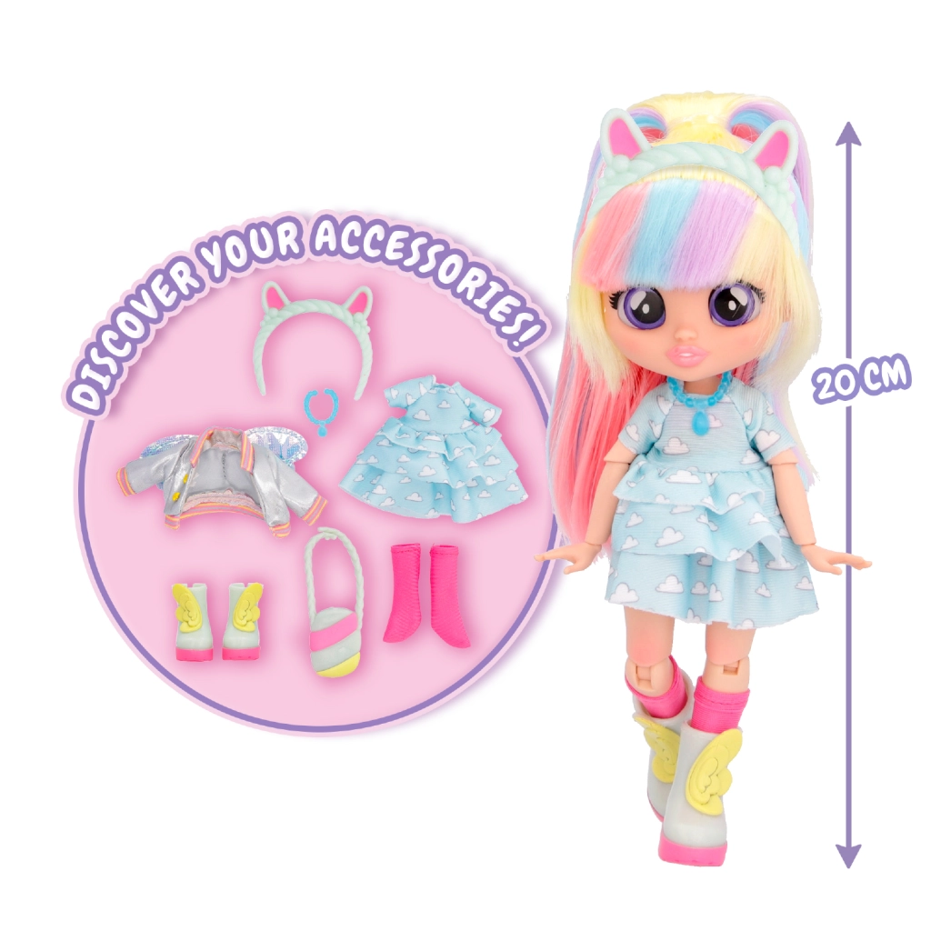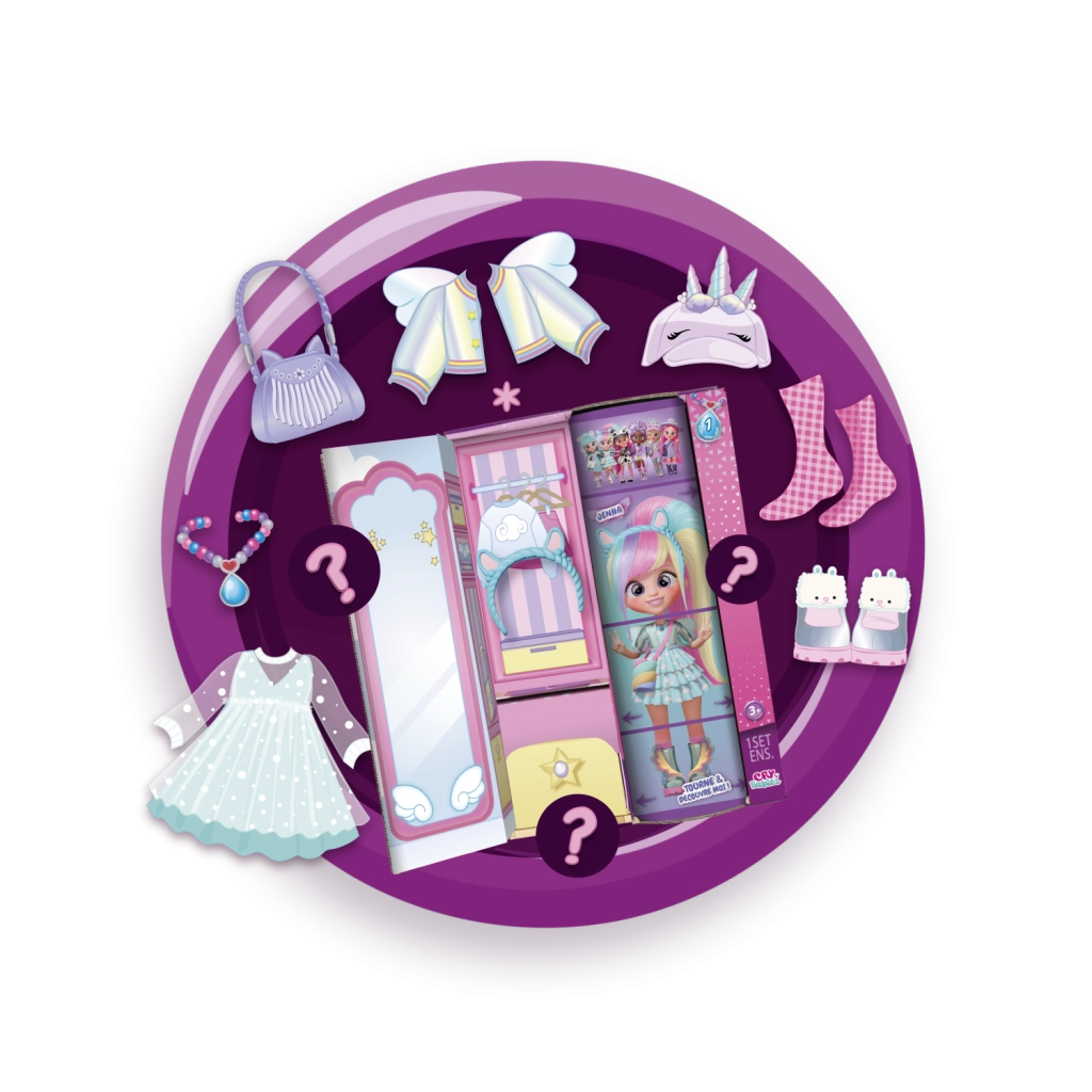 Každá BFF je ukrytá ve speciálním tubusovém balení, které se mění v garderobu. Otočte části tuby a objevujte pózy i tajné přihrádky s doplňky. V sadě na vás čeká přes 9 doplňků: 2 díly oblečení, kabelka, čelenka/čepice, boty se stylovými ponožkami a náhrdelník BFF – vše sladěné do fantazijního „unicorn“ stylu.