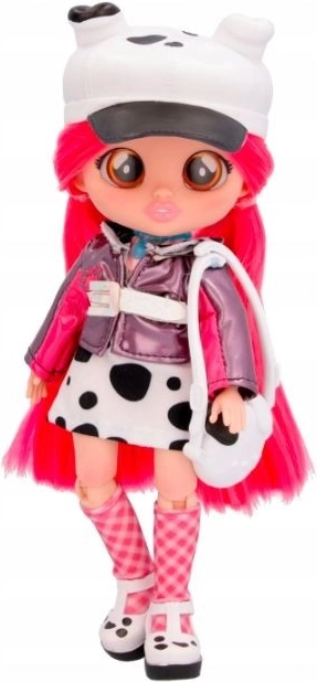 Dotty přichází ve výrazném polka‑dot stylu: puntíkované šaty, metalická koženková bundička, boty Mary Jane na platformě, kostkované ponožky a roztomilá čepice s oušky. Díky pohyblivému tělu snadno zaujme různé pózy – ideální pro módní přehlídky a kreativní hraní.