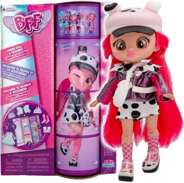 Objevte svou novou nejlepší kamarádku – panenku CRY BABIES BFF Dotty vysokou 15 cm s hedvábnými nylonovými vlasy, křišťálovýma očima a plně pohyblivým tělem. V balení najdete přes 9 překvapení, stylové oblečky a doplňky. Krabička slouží jako šatník, takže zábava začíná hned po rozbalení!
