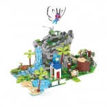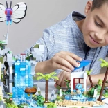 Průhledné modré dílky vytvářejí efekt tekoucí vody. Skalní útesy, palmy a drobné stavby dodávají scenérii hloubku a autentický vzhled pro hraní i vystavení.
