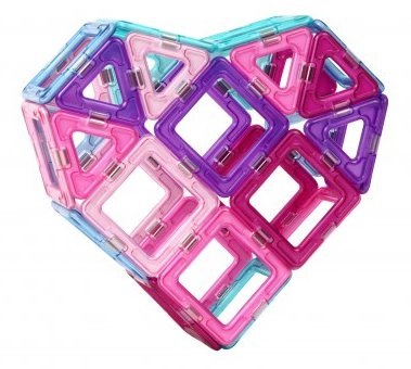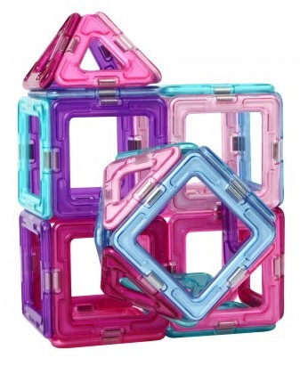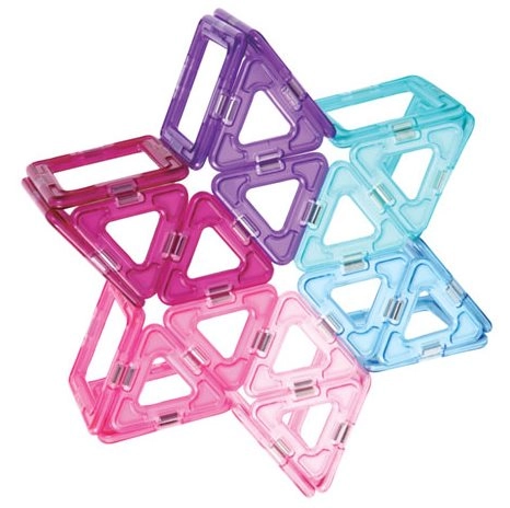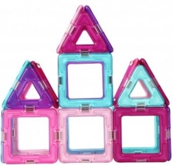 Pastelová edice oblíbené stavebnice přináší 18 čtverců a 12 trojúhelníků v poloprůhledných barvách (růžová, fialová, tyrkysová, modrá). Dílky se spojují spolehlivými magnety po hranách, takže děti snadno vytvoří hvězdy, domečky, srdce i věžičky. Stavebnice je ideální pro první konstrukční pokusy a rozvoj prostorové představivosti.