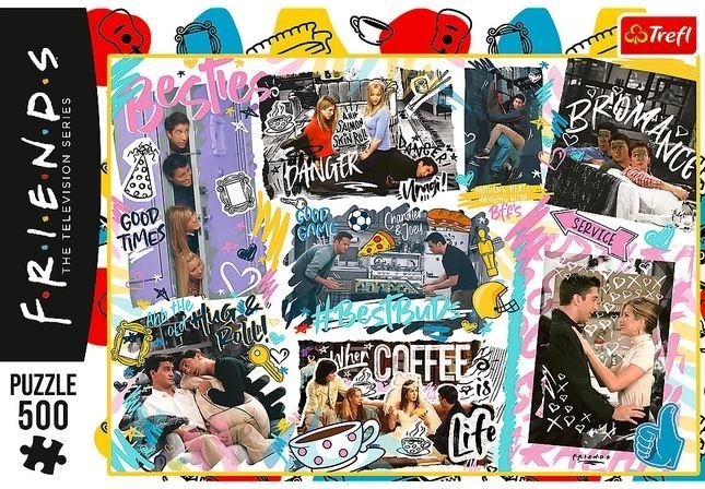 Užijte si relax s kvalitními puzzle Trefl: 500 dílků, motiv Přátelé – koláž, vyrobeno v Polsku, ekologické materiály a papír se strukturou lnu pro menší odlesky a pohodlnější skládání.