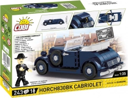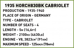 Tato realistická stavebnice zachycuje zkrácenou verzi legendárního vozu HORCH 830BK, známého svou kvalitou a technickými inovacemi. Speciálně navržené prvky pro modely vozidel zajišťují věrné proporce a množství překvapivých detailů. Trvalé potisky místo samolepek dodávají modelu špičkový vzhled a odolnost při hraní.