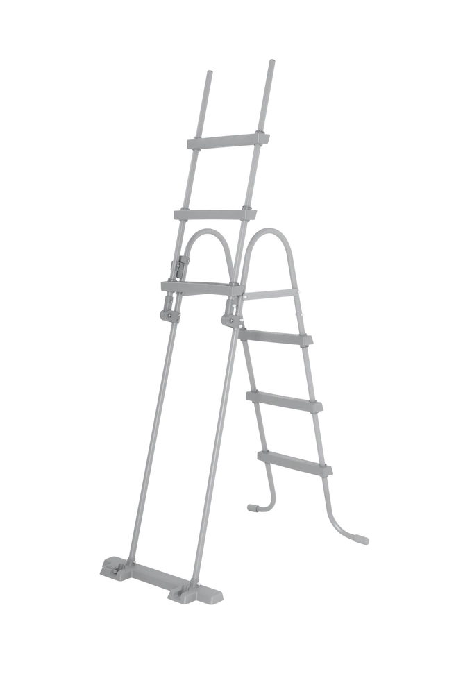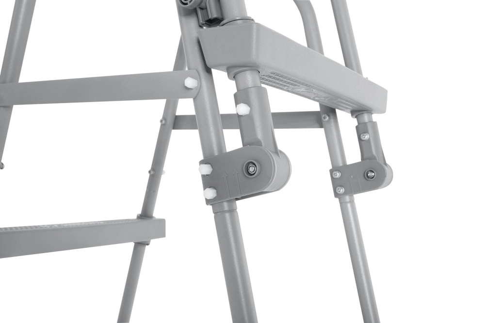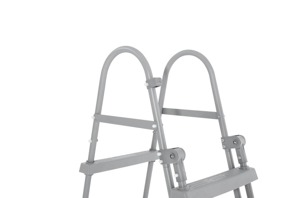 Rám z kovu s antikorozní úpravou v šedém nátěru odolá dlouhodobému venkovnímu používání, plastové stupně s protiskluzovým reliéfem minimalizují riziko uklouznutí. Pro vyšší bezpečnost lze žebřík odklopit směrem nahoru, aby děti bez dozoru nemohly do bazénu.