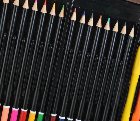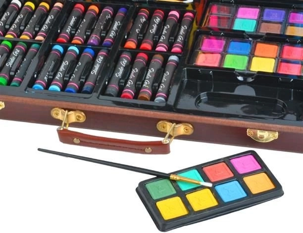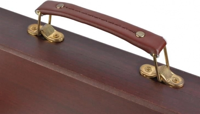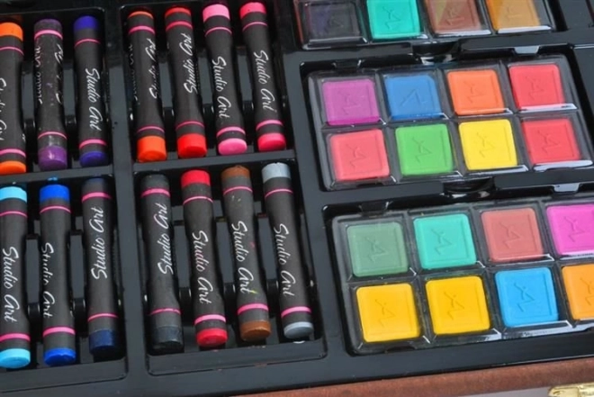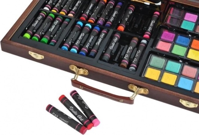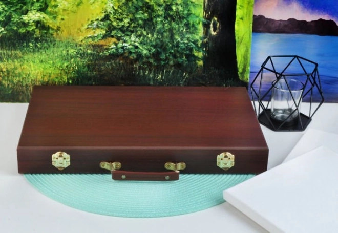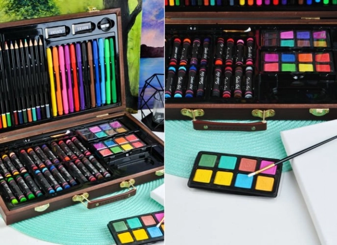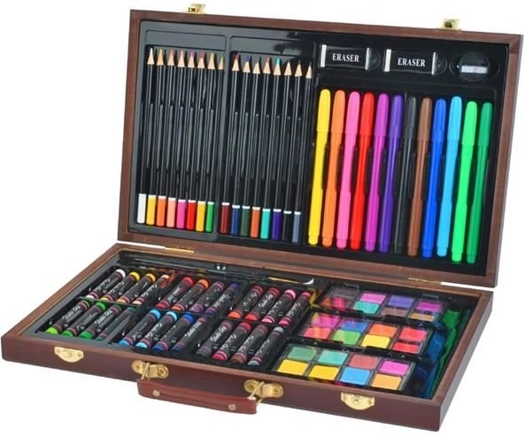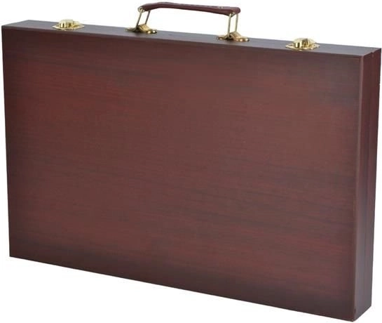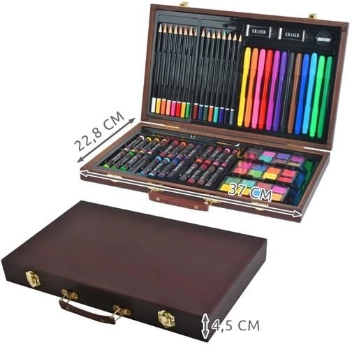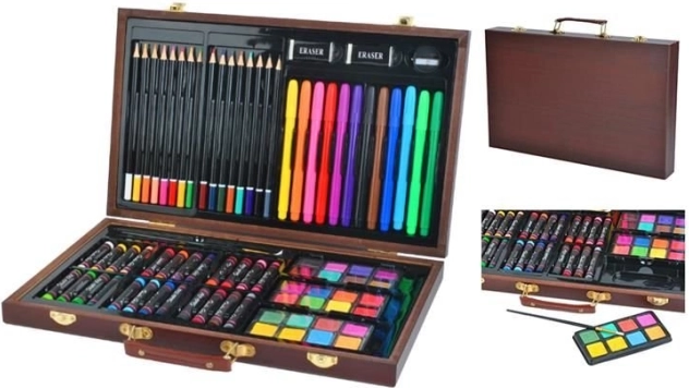 Všechny výtvarné potřeby jsou úhledně uspořádány v rozkládacím dřevěném kufříku s přihrádkami, takže máte vždy rychlý a snadný přístup ke všemu, co potřebujete.