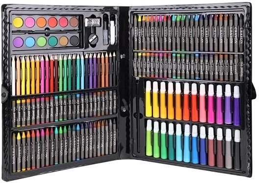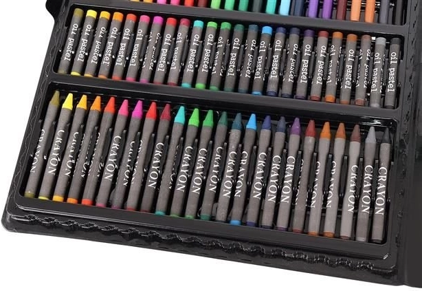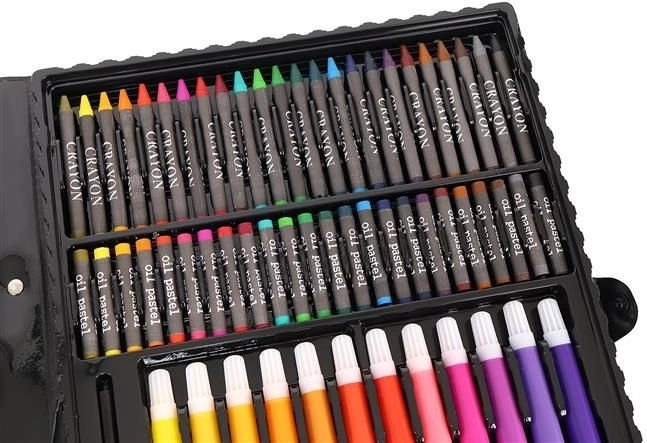Super Mega Sada Uměleckých Potřeb 168 Ks nabízí vše, co potřebujete pro tvorbu uměleckých děl: 24 pastelových kredek, 24 barevných fixů, 48 olejových pastelek, 48 voskových pastelů, 12 akvarelových barev a mnoho dalšího. Všechny potřeby jsou elegantně uspořádány v praktickém pouzdře, což zajišťuje snadný přístup a přehlednost.