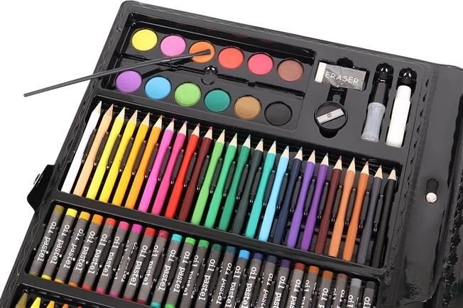 Sada obsahuje široký výběr uměleckých potřeb, od kredek po akvarelové barvy, což ji činí ideální pro rozličné tvořivé projekty.