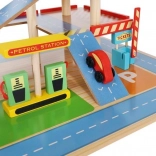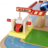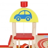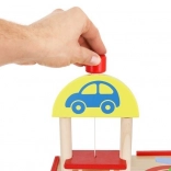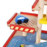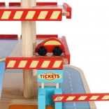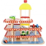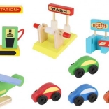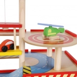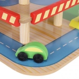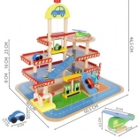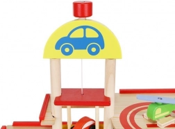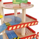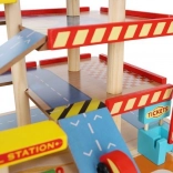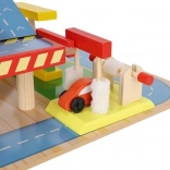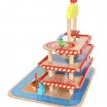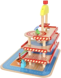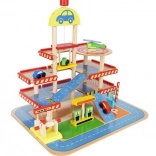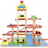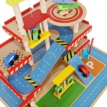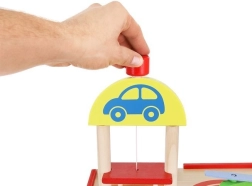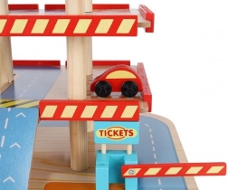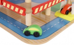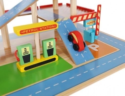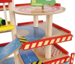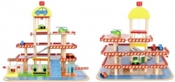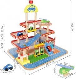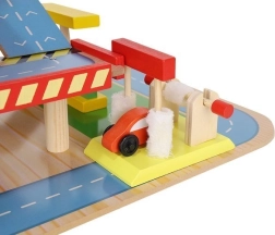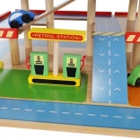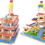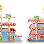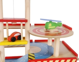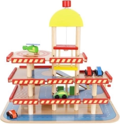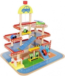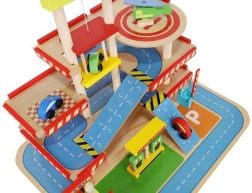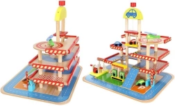 Barevné dřevěné parkoviště s více úrovněmi přinese dětem hodiny zábavy a rozvíjí jemnou motoriku i představivost. Součástí je myčka, čerpací stanice, kasa, výtah, heliport a vozidla. Stabilní konstrukce z bezpečného dřeva a realistické doplňky podporují kreativní hru a učení dopravních situací.