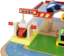 - Bohatá sada 27 dílů: myčka, pumpa, kasa, 3patrové parkování, silnice, výtah, 4 autíčka a helikoptéra.