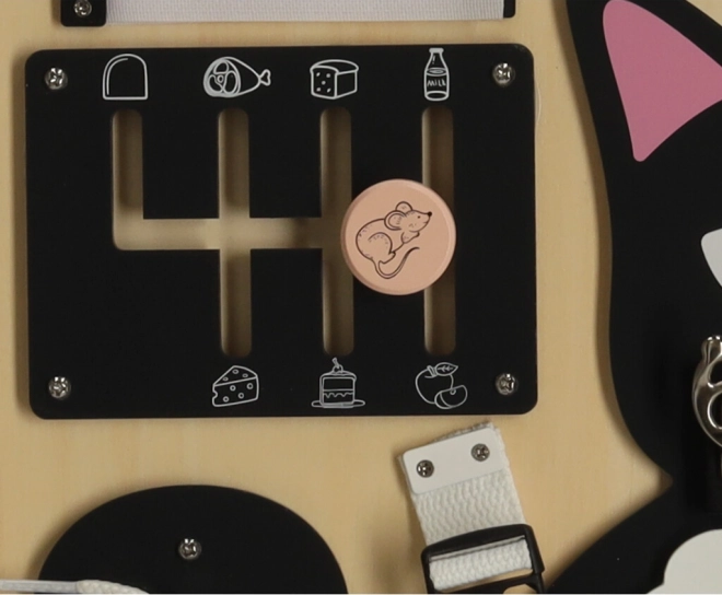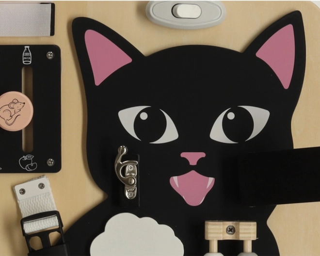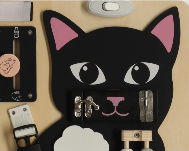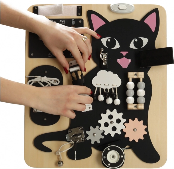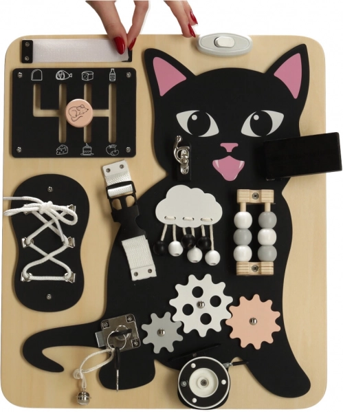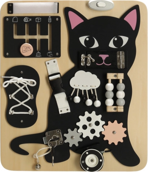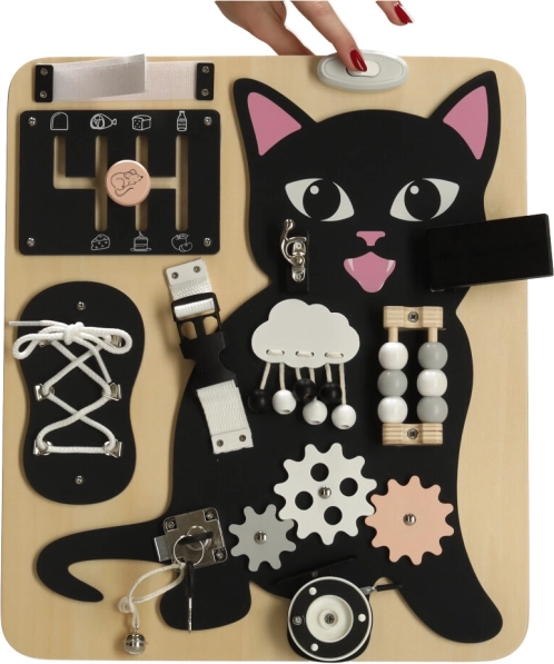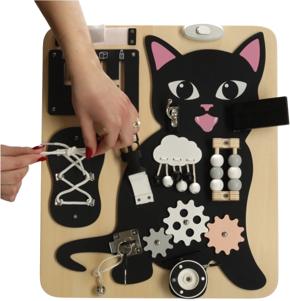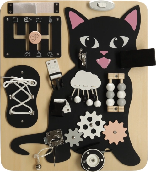 Kombinace černého koťátka se světlými dřevěnými detaily přitahuje pozornost a udržuje dítěti zábavu dlouhé hodiny.