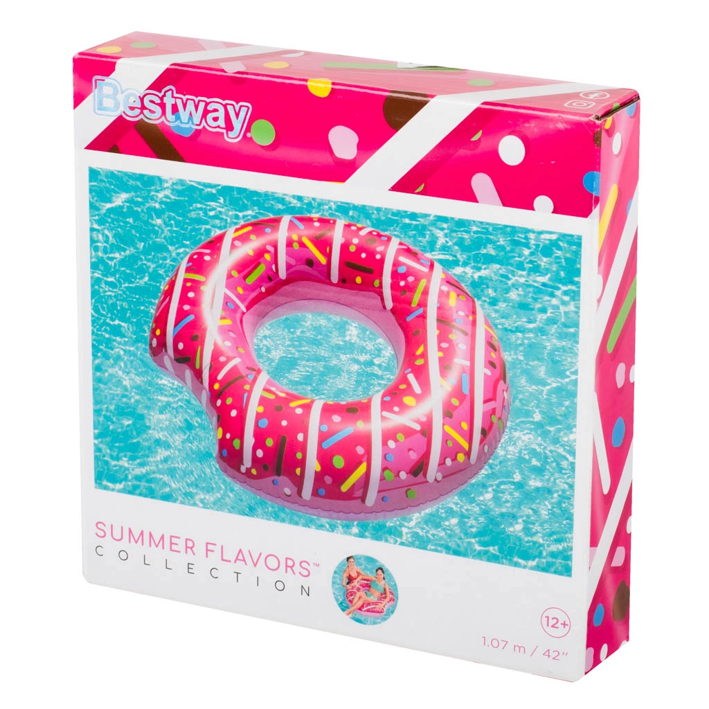 Růžový nafukovací kruh donut BESTWAY 107 cm – stylový design, stabilní opora na vodě a opravná záplata v balení. Ideální na léto pro teenagery i dospělé.