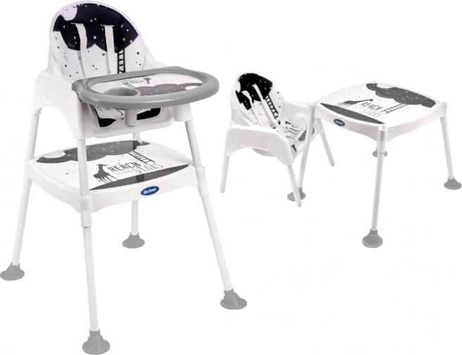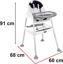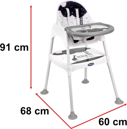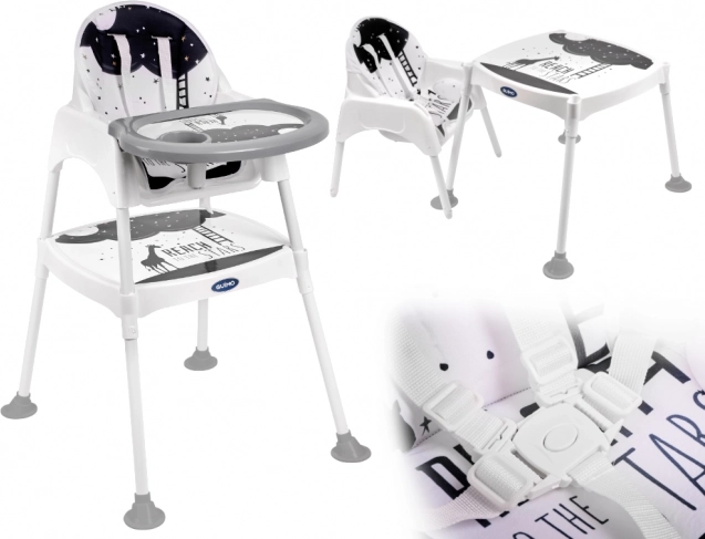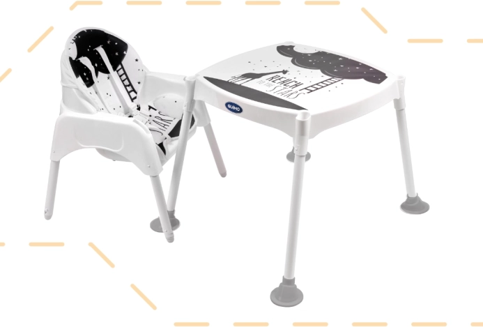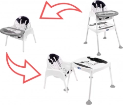 Židlička má až tři různé funkce! Lze ji použít jako židličku na krmení pro děti od 6 do 36 měsíců, a když batole příliš povyroste, můžete výrobek přeměnit nažidličku a stolek. Tato kombinace vám umožní nejen pohodlně jíst jídlo, ale je také skvělá na kreslení a hraní! V této podobě bude bez problémů sloužit až do šesti let!