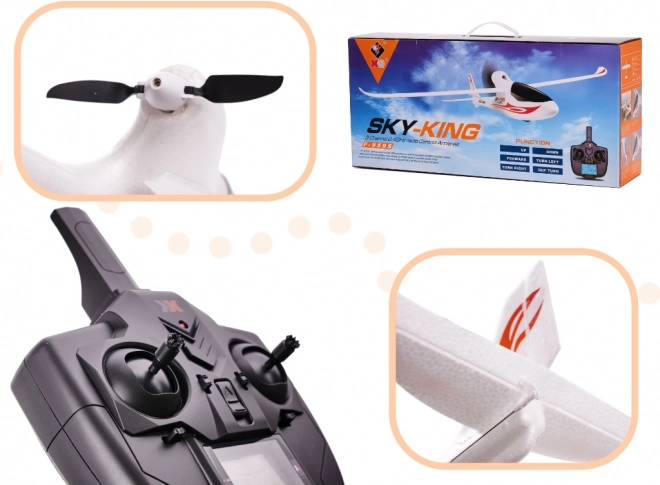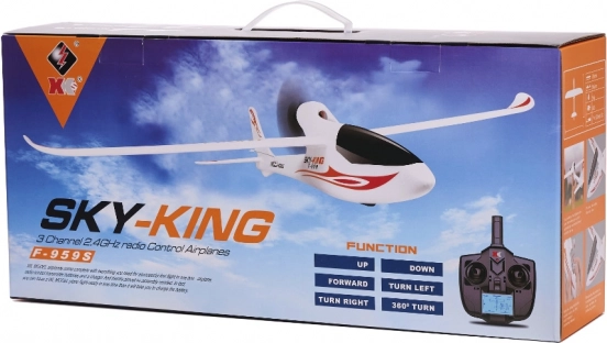 - Letadlo F959S Sky King 3CH RTF, vysílač 2,4 GHz, akumulátor LiPo 7,4 V 300 mAh, nabíječka