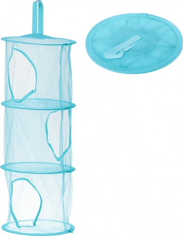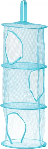 Závěsný síťovaný organizér na hračky se 3 přihrádkami v bleděmodré barvě. Lehký, odolný, prodyšný a snadno zavěsitelný. Ušetří místo a udrží pořádek.