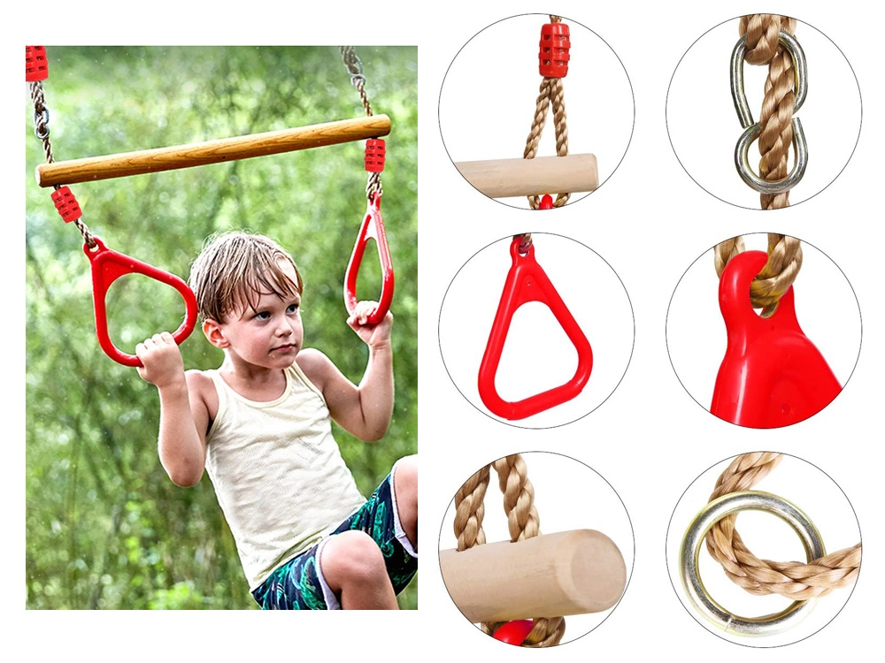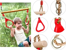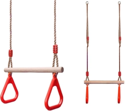 Robustní provedení s přírodní dřevěnou tyčí, pevnými nastavitelnými lany a ergonomickými držadly je navrženo pro bezpečné a pohodlné používání. Barevné prvky motivují děti k pohybu, lezení a houpání.