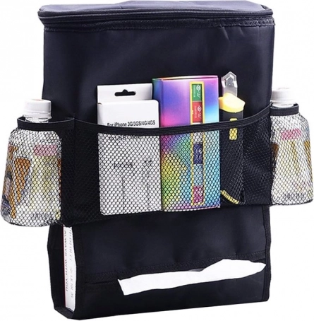 Udržte interiér vozu dokonale uklizený díky praktickému organizéru na zadní stranu sedadla s integrovanou termo taškou. Nabízí velkou izolovanou přihrádku na zip pro uchování nápojů a jídla v optimální teplotě, 3 síťované kapsy na drobnosti a lahve a spodní kapsu na kapesníky. Snadno se montuje, dobře přilne k sedadlu a zároveň chrání opěradlo před nečistotami.