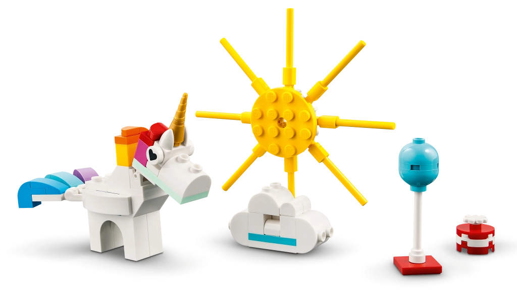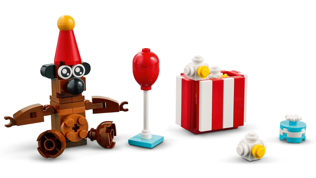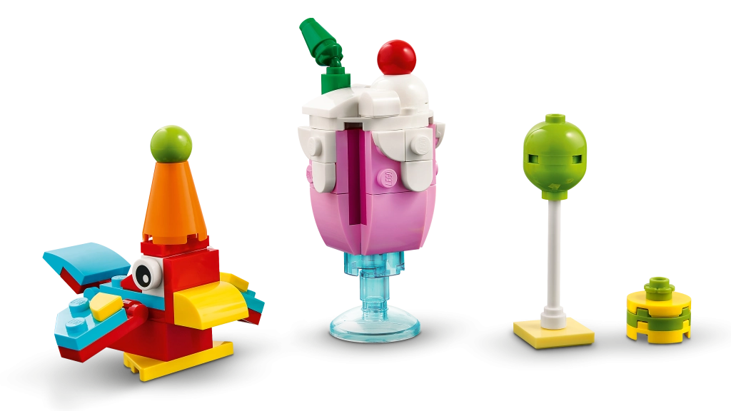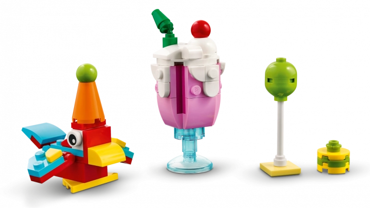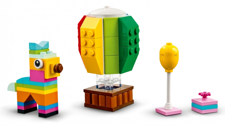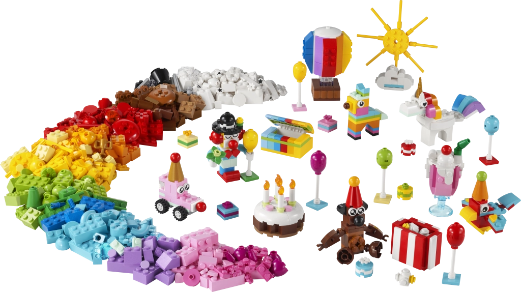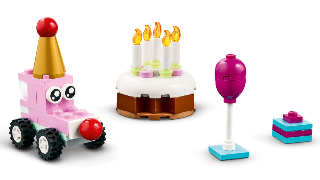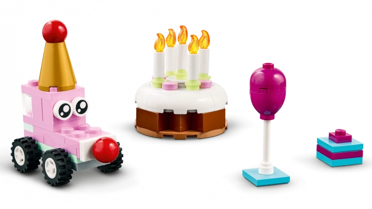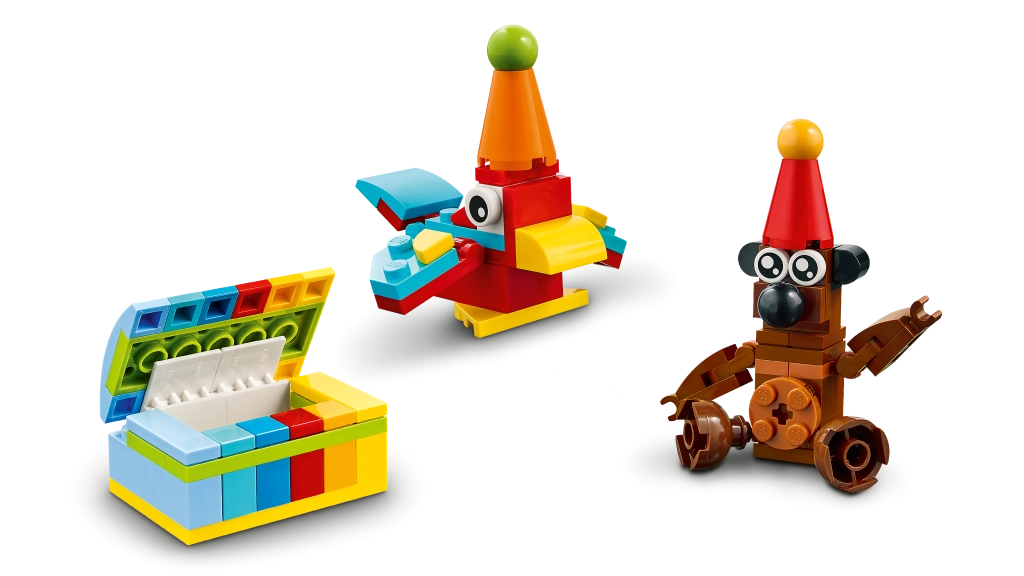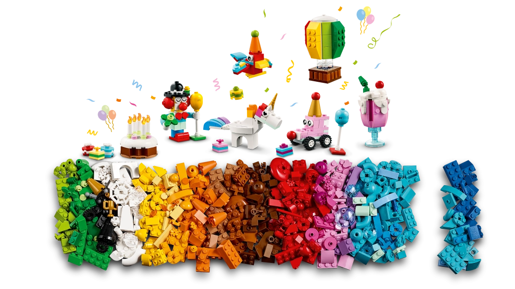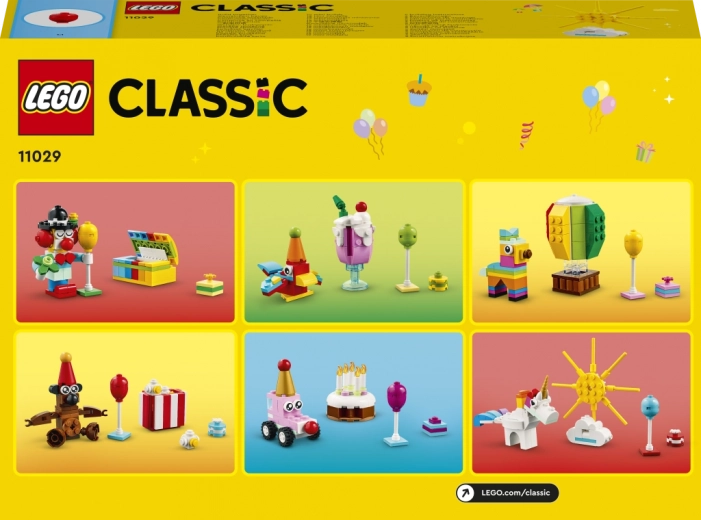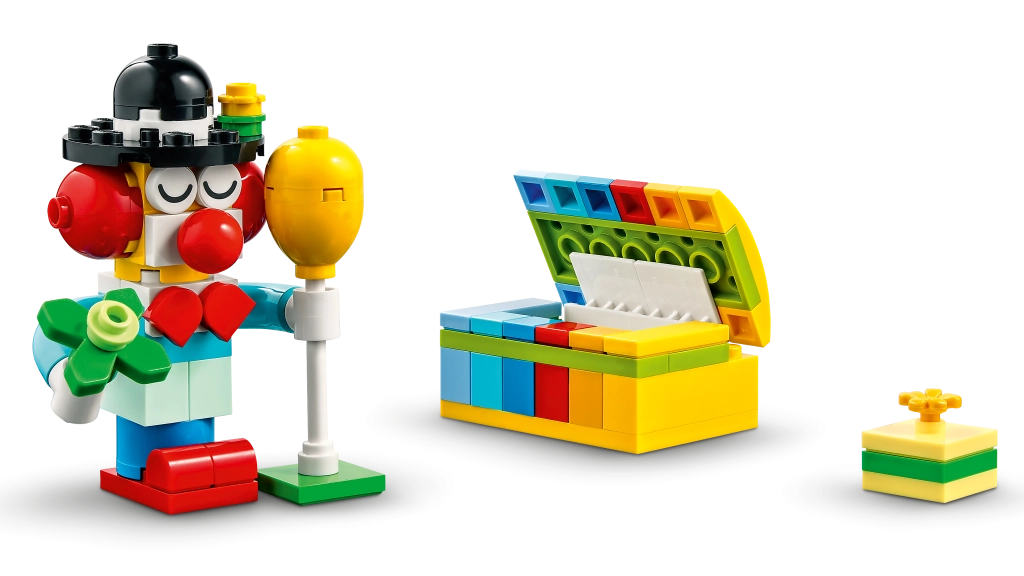 Sdílejte kreativní zábavu s touto barevnou kolekcí kostek. Dílky jsou dodávány v 6 sáčcích, přičemž každý obsahuje kostky a srozumitelné návody k vytvoření 2 jednoduchých modelů. Ty zahrnují medvídka, klauna, jednorožce,pinatu, duhu, dort, popcorn, balónky a malé dárečky. Jedná se o skvělou skupinovou aktivitu na jakoukoli oslavu – a není nutné se stavěním přestávat, jakmile návštěva odejde! Digitální verze návodu na stavění z této stavebnice je také k dispozici v aplikaci LEGO Builder.