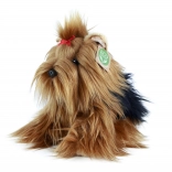 Plyšový pes má detailní zpracování, které věrně připomíná skutečného Jorkšírského teriéra.