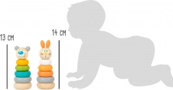 Nadčasová dřevěná hračka, která roste s vaším dítětem. Děti třídí a nasazují kroužky na tyčku, skládají je podle velikosti a objevují barvy. Figurky zajíčka a medvěda motivují ke hře a zároveň zdobí dětský pokoj svým jemně pastelovým vzhledem.
