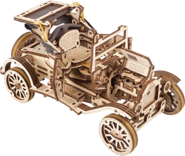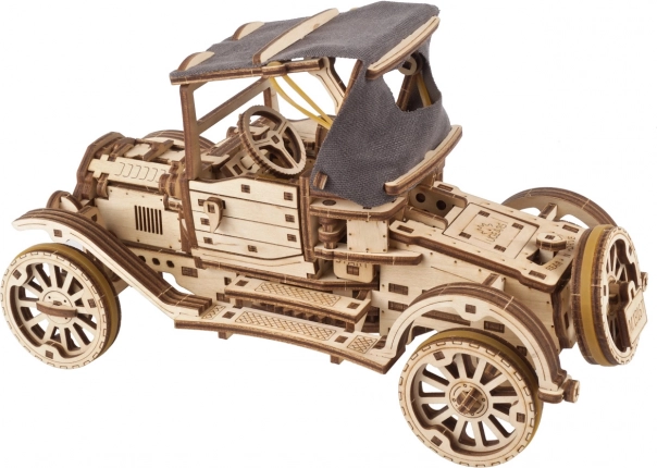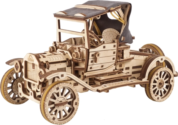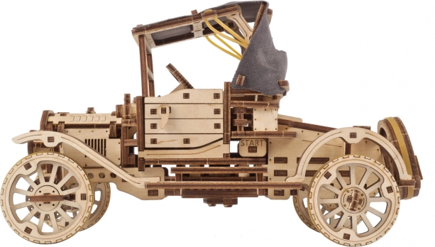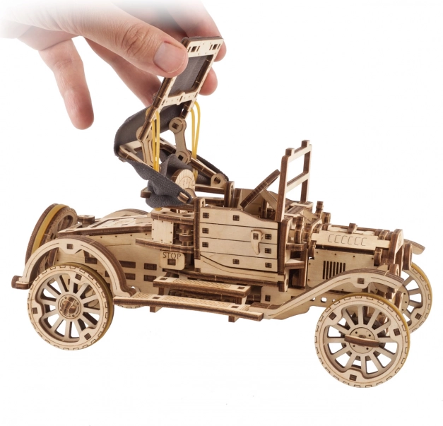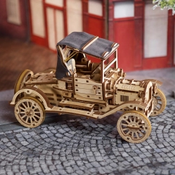 Vstupte do světa historických vozidel s tímto dřevěným modelem inspirovaným ikonickým vozem Ford Model T. Model nabízí otevírací dveře, skládací plátěnou střechu a možnost samostatné jízdy včetně zpětného chodu.