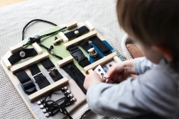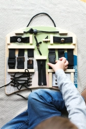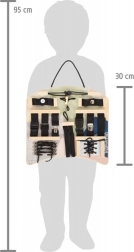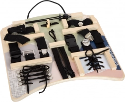 Tato interaktivní aktivní deska nabízí širokou škálu spojovacích a vázacích prvků, které děti znají z každodenního života. Při zapínání a rozepínání zipů, zapínání knoflíků, utahování přezek či vázání tkaniček si procvičí přesný úchop, trpělivost a koordinaci pohybů. Ergonomický tvar je pohodlný pro hraní před dítětem i na klíně a díky praktickému madlu lze desku snadno zavěsit.