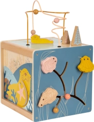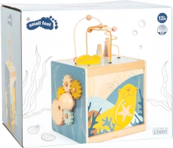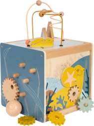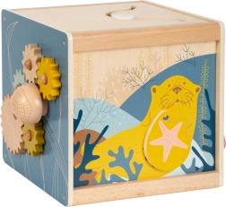 Všestranná dřevěná motorická kostka s motivem moře od značky Small Foot nabízí 5 hracích ploch, dvě korálková bludiště, otáčecí ozubená kolečka se snímatelnými hvězdicemi a měkkou medúzou pro třídění tvarů. Podporuje jemnou motoriku, koordinaci oko–ruka a smyslové vnímání. Odnímatelné víko šetří místo při ukládání, bezpečné zaoblené hrany a kvalitní dřevěné zpracování v módních barvách potěší děti i rodiče.