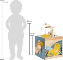 Tato designová motorická kostka kombinuje přírodní dřevo a jemné mořské motivy pro hravé učení. Dvě korálková bludiště na vrchu, posuvné dráhy, zrcátka a malé klapky lákají k objevování, zatímco ozubená kolečka s hvězdicemi a měkká medúza podporují rozpoznávání tvarů a příčinných souvislostí. Odnímatelné víko lze uložit dovnitř kostky pro úsporu místa.