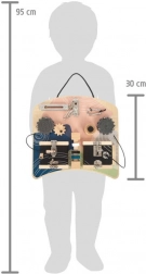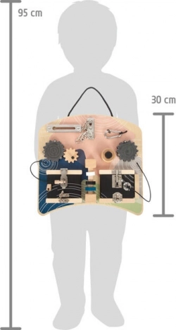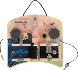 Tato stylová montessori „busy board“ v příjemných pastelových barvách nabízí dětem bohaté možnosti objevování. Různé zámky a západky známé z každodenního života, ozubená kola s mini bludištěm, závitová tyč s otočnými prvky i zábavný pískací klakson rozvíjejí dovednosti hrou a motivují k přirozenému učení.